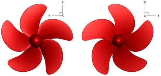 As shown in Figure 1, two identical KP505 propellers are selected as the simulation models, the open-water experimental data of KP505 can been found in the Tokyo CFD Workshop (2015) [25]. The details of the KP505 propeller are presented in Table 1.