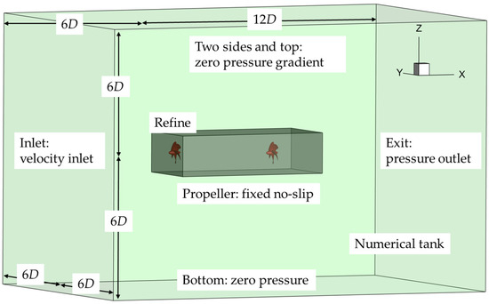 As shown in Figure 2, the computational domain extends from −6D to 12D along the X-axis, −6D to 6D along the Y-axis, and −6D to 6D along the Z-axis (where D is the diameter of the propeller). The inlet and outlet along the X-axis are set as velocity inlet and pressure outlet boundary conditions, respectively. The two side boundaries and the top are assigned as zero pressure gradient conditions, while the bottom of the domain is set as a zero pressure condition.