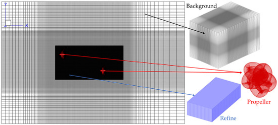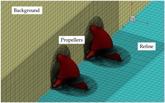 The structured overset grid method is applied for both grid generation and propeller rotation simulations. As shown in Figure 3, the computational grids consist of background grids, refined grids, and model grids. To better capture the detailed flow field around the propeller, the refinement regions are carefully defined to suit different simulation conditions, details of the mesh distribution are illustrated in Figure 4.