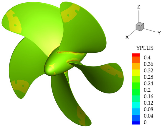 The near-wall mesh height is set appropriately to meet the requirements of the chosen turbulence models, as shown in Figure 5, the nondimensional wall distance Y+ distribution on the propeller surface is generally less than 0.5.