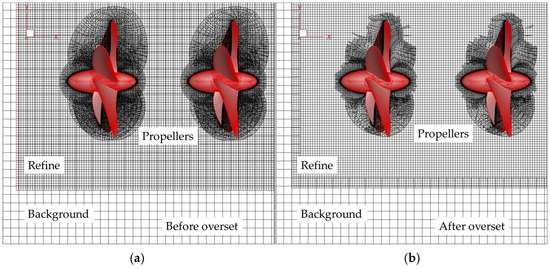 The dynamic overset grid method is applied in the simulations. The main procedures of the in-house overset grid code include hole-digging, point-searching, and interpolation. The hole-mapping method [30] coupled with the cut-paste algorithm [31] is used to identify the hole nodes and remove unnecessary cells prior to computation. The ADT algorithm is employed to search for the donor nodes of the interpolation points. Computational information between the donor points and interpolation points is obtained using the trilinear interpolation method [32]. The dynamic overset grid technique has been employed in numerous propeller-related simulations [33,34].