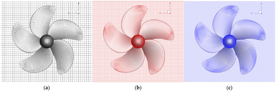 According to the convergence study method proposed by Stern et al. [39] and Xing et al. [40], a minimum of three solutions in different grids and time-steps should be used in the convergence studies. Three sets of grids are shown in Figure 7 and Table 2, and the refinement ratio between solutions is assumed as: