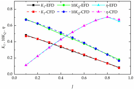 Except for J = 0.9, which exhibits relatively large discrepancies between CFD and EFD data, the errors for the other advance coefficients remain within 4%. The open-water characteristics curve is plotted in Figure 8. Overall, the computational results align well with the EFD data.