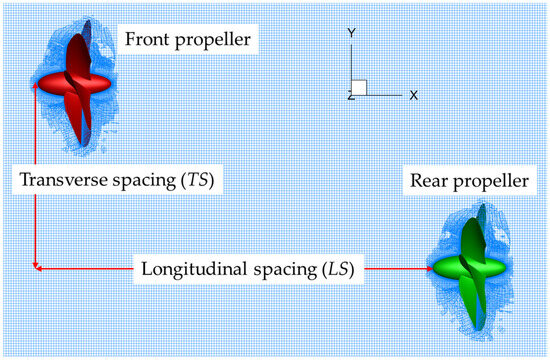 The transverse spacing (TS) ranges from 0 to 1.6D, while the longitudinal spacing (LS) varies from 0.5D to 4D (where D represents the propeller diameter). The spacing between the front and rear propellers in both the transverse and longitudinal directions is defined in Figure 9. The specific layout is detailed in Table 8.