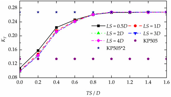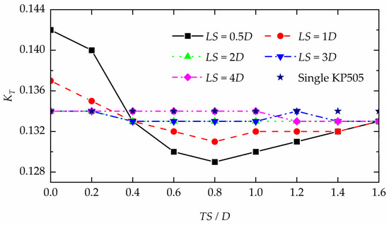 The total KT of the two-propeller configuration in different arrangements.