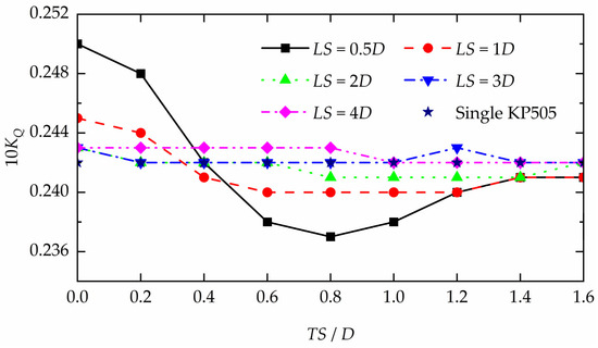 The total 10KQ of the two-propeller configuration in different arrangements.