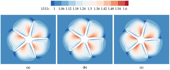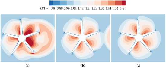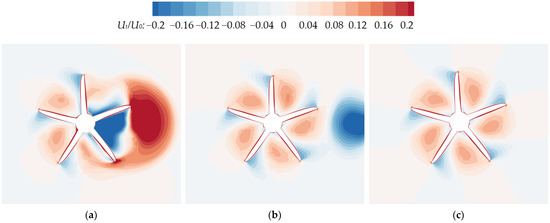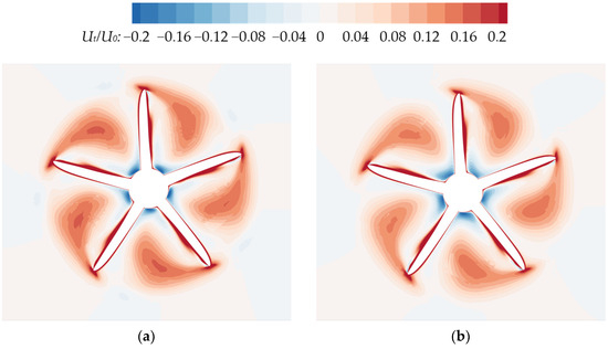 As for the different transverse spacings, when the transverse spacing between the two propellers is small (TS < 0.6D), the thrust and torque coefficients of the rear propeller are significantly reduced due to the interference from the front propeller. As shown in Figure 18, Figure 19, Figure 20 and Figure 21, both the axial and tangential velocity distributions on the rear propeller plane at TS = 0 (Figure 18a and Figure 19a) and 0.4D (Figure 20a and Figure 21a) are considerably greater than those of a single KP505 propeller in Figure 20c and Figure 21c. An increased onset flow velocity deteriorates the hydrodynamic performance of the rear propeller, as discussed in Section 4.3. Furthermore, according to blade element theory [37,41], the fundamental parameters are defined as follows: