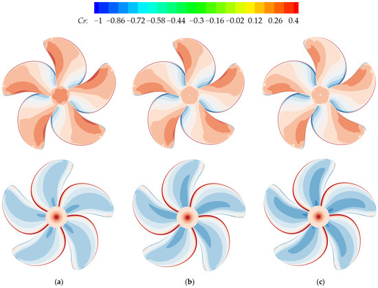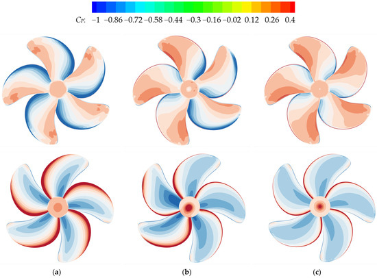 Figure 23 presents the pressure distributions on the surface of the rear propeller under different conditions. Due to the high-speed axial inflow velocity, the pressure distributions on the rear propeller are higher on the suction side while lower on the pressure side (Figure 23a,b) compared to those of the single KP505 propeller (Figure 14b). The reduction in the pressure difference between the pressure and suction sides also accounts for the reduction in the hydrodynamic loads of the rear propeller.