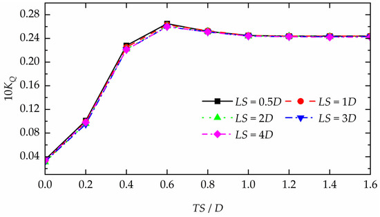 The total thrust and torque coefficients for the two-propeller configuration under various arrangements are shown in Figure 24 and Figure 25. For the two-propeller configuration investigated in this study, the interaction effect is primarily manifested in the impact of the front propeller wake on the hydrodynamic performance of the rear propeller, while the rear propeller has a relatively small influence on the front propeller. Consequently, the variation trends of the total thrust and torque coefficients are almost identical to those of the rear propeller.