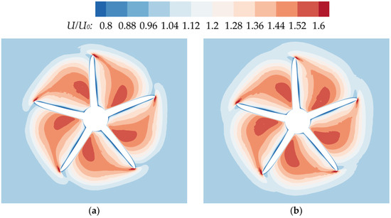 The axial velocity distributions on the rear propeller plane at different longitudinal spacings: (a) C2 (TS = 0, LS = 1D; (b) C5 (TS = 0, LS = 4D).