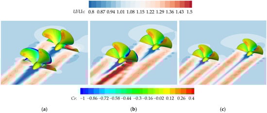 When the transverse spacing between propellers is minimized, both the axial velocity U and the tangential velocity Ut of the rear propeller are elevated compared to the single KP505 propeller. This increase induces an increased hydrodynamic pitch angle βi, ultimately reducing the angle of attack . Within the practical operational range (characterized by small angle of attack values), the lift coefficient CL exhibits approximate linear proportionality to the angle of attack , while the drag coefficient [37,42]. The concurrent decrease of CL and CD, with diminishing , directly correlates with observed reductions in thrust and torque coefficients under minimal transverse spacing conditions. Particularly at TS = 0, the rear propeller is entirely immersed within the high-velocity wake generated by the front propeller, as visualized in Figure 22a. This arrangement induces severely elevated inflow velocities, resulting in negative thrust coefficients for the rear propeller as demonstrated in Table 11 and Figure 15.