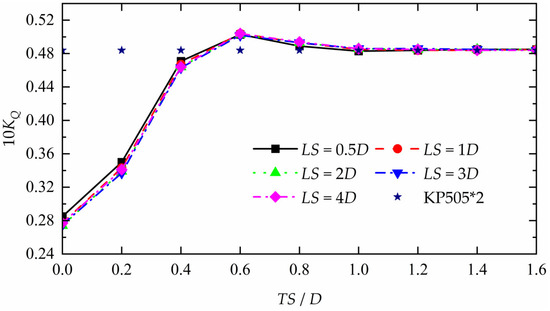 The thrust and torque coefficients of the front propeller under different simulation conditions are presented in Table 9 and Table 10. It can be observed that the variations in the thrust and torque coefficients of the front propeller under different operating conditions are relatively minor. Among the 45 arrangements analyzed, the maximum differences in the thrust and torque coefficients of the front propeller are approximately 6% and 3% (C1), respectively, when compared to those of the single KP505 propeller. Except for cases at LS = 0.5D and 1D, where variations in KT and KQ under certain transverse spacings are more pronounced, the amplitudes of the thrust and torque coefficients remain largely consistent under other operating conditions.