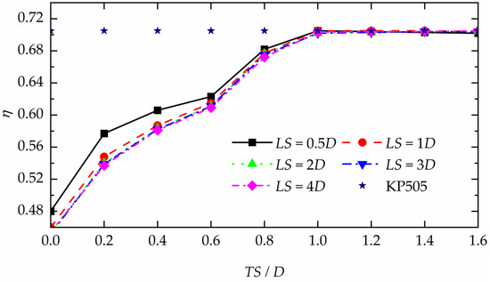 For transverse spacing values exceeding TS = 0.2D, the two-propeller configuration produces higher combined thrust than the single propeller configuration (Figure 24). However, to achieve double the thrust output of the single KP505 propeller, the transverse spacing of the two-propeller configuration should be at least TS ≥ 1D. Notably, this system attains peak efficiency comparable to the single KP505 propeller when TS ≥ 1D. Therefore, to ensure optimal thrust and efficiency of the two-propeller configuration, the transverse spacing between the two propellers should be maintained at no less than 1D.