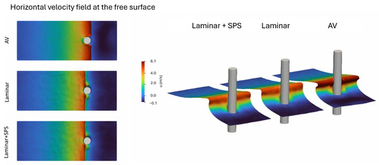 Figure 2 shows the horizontal velocity field at the free surface for the three dissipation schemes tested in the SPH framework. The left panels provide a top view of the velocity field, while the right panels show an isometric view that highlights the interaction between the breaking wave and the vertical cylinder. The snapshots correspond to the moment just before the breaking wave impact (, with defined at the seventh wave cycle, when the simulations reach a repeatable state), for the case with model resolution . The comparison illustrates the influence of the dissipative scheme on the velocity distribution and flow structure near the breaking point. In the AV simulation, the wave front appears significantly more diffused, with a smoother velocity gradient in the wave crest region. This is indicative of excessive numerical dissipation, which tends to dampen wave-breaking dynamics and reduce the flow intensity near the structure. The laminar model, in contrast, preserves sharper gradients in the velocity field, especially around the leading edge of the wave and pile impact zone, consistent with the finding in [15], which showed that a laminar model can be reasonably accurate at breaking onset. The laminar + SPS model maintains the sharpness of the wave front observed in the laminar case while also producing smoother, more physically consistent flow structures around the pile. The velocity field retains high intensity in the breaking region, but it limits the excessive damping seen with AV and the slight noise apparent in the purely laminar simulation. From the right panel of Figure 2, the free surface from the AV simulation appears flattened and lacks the three-dimensional flow structures associated with breaking waves. In contrast, the laminar and SPS-enhanced models reproduce more realistic breaking wave forms, with the SPS model showing well-structured crest overturning and more accurate representation of the impact zone on the pile. These results confirm that, while AV may be sufficient for general wave propagation, it seems to underestimate local flow dynamics during wave breaking and impact. The laminar + SPS model provides a more robust and physically consistent description of the near-surface horizontal velocity field, which is particularly important in applications involving wave–structure interactions. Notably, a slight shift in the timing of the wave impact on the pile is observed. In the AV simulation, the wave appears to impact the structure slightly earlier. This anticipated impact is caused by a numerical artifact introduced by artificial viscosity. Specifically, the dissipation smooths the wave crest and reduces its steepness, effectively altering the local wave nonlinearity and leading to a phase shift in the wave’s position relative to the experimental case. As a result, the crest reaches the structure prematurely in the simulation. This behavior is particularly evident in simulations with higher values of the artificial viscosity parameter, while the wave celerity apparently increases for lower values of , as illustrated in Appendix A and Figure A1. An additional comparison is made for the same case with , where the excess of numerical dissipation between the fluid and bottom causes an important delay in the wave-breaking and impact process. This delay is consistent with the overall reduction in wave energy and speed due to numerical dissipation.