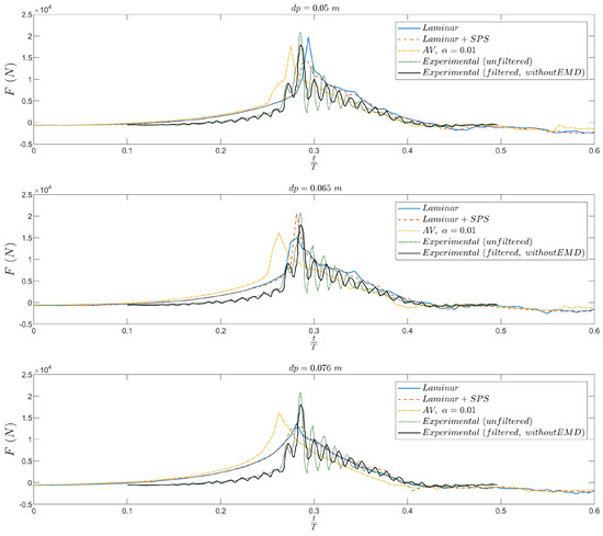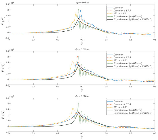 When comparing Figure 5 and Figure 6, it is evident that the experimental signal processed with EMD (black solid line) provides a more stable and physically interpretable reference because it removes the residual, high-frequency oscillations observed in the raw and simply filtered signals. The EMD-processed curve reveals a well-defined and smooth impact peak that aligns closely with the laminar and SPS simulations, further supporting their accuracy.