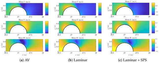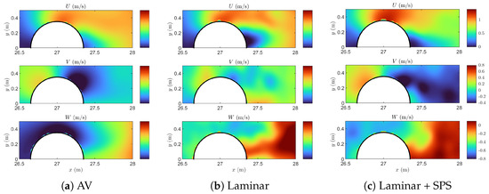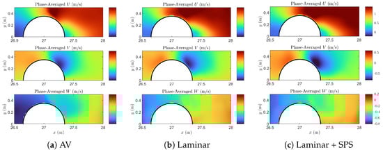 Figure 9 shows the phase-averaged velocity components at and mid-depth (). The phase-averaged fields represent the repeatable, wave-coherent motion of the fluid, filtered from turbulent fluctuations and numerical noise by averaging over seven wave cycles. The streamwise component displays the expected acceleration toward the pile and the deceleration in the wake region. All three models show a strong velocity gradient near the cylinder front, but the laminar and laminar + SPS models exhibit a slightly sharper transition, particularly close to the cylinder edge. The vertical component reveals a downward jet behind the cylinder, indicative of plunging wave behavior at this instant. The AV model again shows a milder pattern with lower peak magnitudes. The cross-stream component V also highlights significant differences. In both the laminar and laminar + SPS models, the component shows a strong lateral divergence around the pile, with a pronounced negative region downstream. This is associated with the side ejection of fluid induced by flow separation. The AV model captures the general trend but with attenuated magnitude and more diffused contours.
