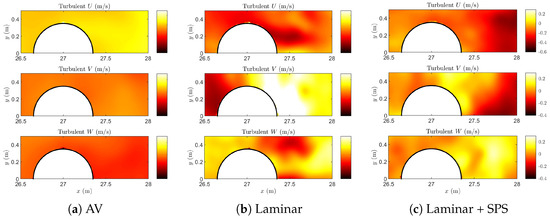 The results shown hereafter refer to the highest model resolution, namely, . The time is chosen to favor an easier comparison with results in [15]. Figure 7 presents the instantaneous velocity fields for the three velocity components, U, V, and W, extracted at mid-depth (), comparing the three dissipation schemes. The results of the AV model in Figure 7a show a relatively smooth and diffused flow pattern, especially for V and W. The horizontal velocity, U, exhibits a gentle transition around the cylinder, with a low gradient and relatively uniform distribution in the downstream region. The smoothing introduced by the AV model is expected to suppress the formation of coherent vortical structures. The laminar model in Figure 7b depicts more variation in the velocity field, with larger velocity gradients behind the cylinder, although the updated V field appears smoother than previously described, with milder cross-stream velocity variations and limited structure. In general, the flow pattern indicates the presence of more defined wake dynamics and cross-stream motion compared to AV. Nevertheless, it is hypothesised that this result is underpredicted (compared to that in Figure 7c), as resolving the turbulence with a laminar model would require refining the computational mesh and time step to the level of a direct numerical simulation (DNS). This, however, is not a viable option for the present 3D wave–structure interaction case. Looking at the laminar flow with the addition of the SPS model in Figure 7c, all three components show more spatial variability, with clear indications of energetic flow features around and behind the cylinder. The V and W distributions reveal intense cross-flow and vertical motion, respectively, suggesting stronger vortical activity and more energetic wake dynamics. The U field presents sharper gradients across the wake, indicative of enhanced turbulence mixing. The coherent structures are more in line with the physical expectations of the wave–structure interaction under a breaking wave impact. In general, these results highlight how the turbulence treatment affects the instantaneous velocity distribution. While the AV model leads to excessive smoothing, the laminar and especially the laminar + SPS models preserve sharper flow features and more physically representative dynamics. This supports the need for accurate turbulence models in SPH to capture the complex and transient nature of wave–structure interactions.