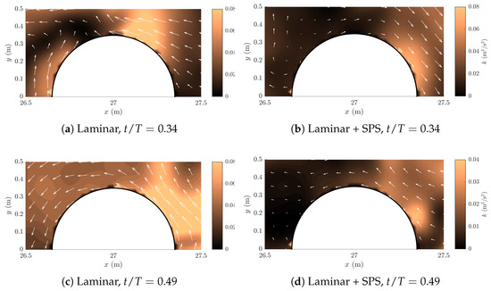 Turbulent kinetic energy distribution k (m2/s2) and velocity field below the free surface. Comparison between laminar and laminar + SPS simulations at two time instants: (beginning of the slamming phase) and (end of the impact). The wave propagates from left to right.