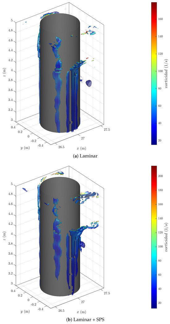 The first term in Equation (9) represents the laminar viscosity, with being the kinematic viscosity of the fluid, which is equal to . The second term accounts for the SPS turbulence model [38], which introduces eddy viscosity via the Smagorinsky model: