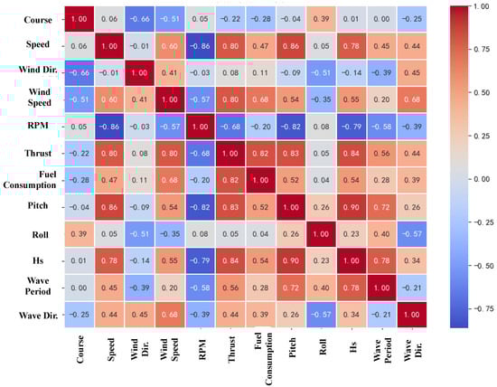 To improve the accuracy of the model, correlation analysis was conducted on the preprocessed data. Based on the results, the degree of correlation between different feature parameters can be determined, thereby providing support for subsequent analysis. Following these cleaning procedures, a final dataset comprising 10,226 valid data points was retained for ship speed prediction. A partial subset of the multi-source data after preprocessing is shown in Table 1. The wind and wave direction are given in an absolute Earth-fixed reference system, with 0° corresponding to the north, increasing clockwise (i.e., 90° is east, 180° is south, etc.)