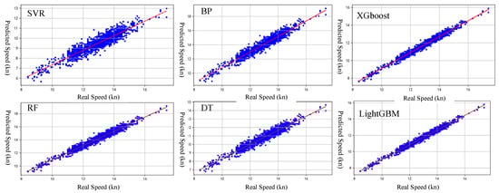 In summary, the scatter plots in Figure 3 visually confirm the numerical evaluation results, reinforcing the conclusion that boosting-based ensemble models, particularly LightGBM and XGBoost, offer superior predictive accuracy and stability for ship speed prediction using shipboard observational data.