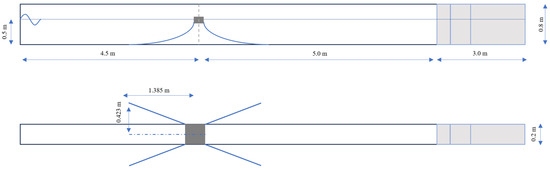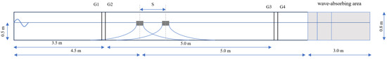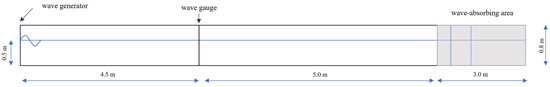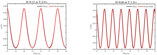 The accuracy of wave generation in the empty numerical wave flume (Figure 1) was confirmed first. The size of the numerical wave flume was 12.5 m long and 0.8 m high, and the still water depth is 0.5 m. Since two-dimensional cases were considered in the present study, the flume had a width of 0.2 m but only one mesh in that direction. A uniform mesh was set in the area on the left side of the flume, which was 9.5 m long. In both the longitudinal and vertical directions, the mesh size was set as 100 meshes per meter. A 3 m-long wave-absorbing area was set on the right side where meshes were horizontally stretched for damping waves. A wave absorber was set on the right wall to minimize reflection. A wave gauge was placed 4.5 m away from the wave generator to record surface fluctuations. In this section, two fifth-order Stokes waves with incident wave heights of Hi = 0.12 m and 0.06 m and wave periods of Ti = 2.0 s and 1.0 s were considered incident waves based on the following validation and numerical experiments. The total simulation time of each case was 30 s and stable data from 12 s to 19 s were selected for comparison with the theoretical results.