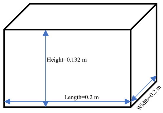 After verifying the accuracy of wave generation, the physical model test data of Wu et al. [26] were chosen to further validate the accuracy of the present model in predicting the motion of a floating box under the action of waves. The numerical setup of this section is shown in Figure 3. The sizes of the numerical wave flume and still water depth were the same as the ones detailed in Section 3.1. A single floating box, whose mass center was 4.5 m from the wave generator, was placed in the flume. The length and width of the floating box were 0.2 m, the height was 0.132 m, as shown in Figure 4, and the submergence percentage (the ratio of submerged height to total height) was 60%. The mesh size in the longitudinal direction was 0.01 m while three mesh sizes of 0.005 m, 0.01 m, and 0.02 m in vertical direction were selected to test the mesh convergence of the present model. The mesh density of the floating box was the same as that of the background meshes. The overset mesh region was slightly larger than the box and was 0.3 m in length, 0.2 m in width, and 0.22 m in height. Four mooring lines were connected to each corner of the box and fixed to the bottom of wave flume. The length of each line was 1.455 m, the modulus of elasticity E was 2.78 MPa, and the axial stiffness EA was 29 N. Each line was discretized into 40 segments. To demonstrate the capability of the present model in simulating the motion of floating bodies under large-amplitude waves, a fifth-order Stokes wave with Hi = 0.12 m and Ti = 2 s was selected as the incident wave.