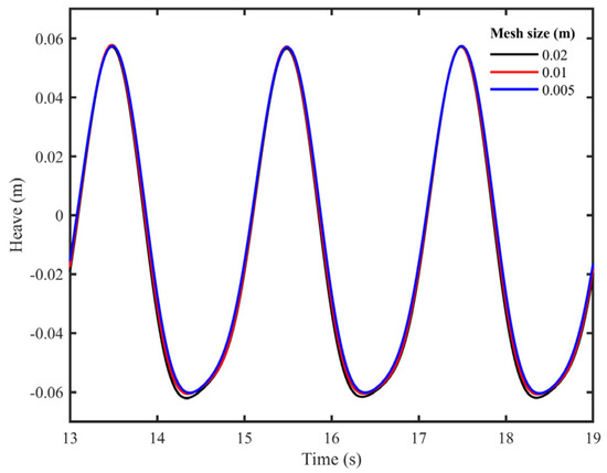 Figure 5 shows the computed heave of the floating box with three mesh sizes in the vertical direction. The simulated results of three mesh sizes were very close and only the results of the coarse mesh size (0.02 m) showed a slight difference at the peaks and valleys. This indicates that the model calculation was convergent with these three mesh sizes. Based on this comparison, the present study used 0.01 m as the mesh size in the vertical direction for the following simulations.