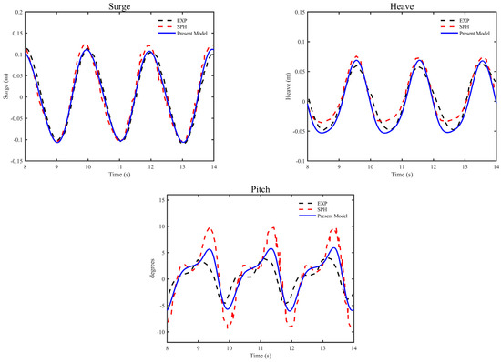 where Xmod represents the simulation results, Xexp represents the experimental data, and the overbar means the mean value. The closer the SKILL value is to 1, the better the agreement between the numerical simulation results and the experimental data is. According to the equation, the SKILL values of the present model for surge, heave, and pitch predictions were 0.9849, 0.9425, and 0.7602, respectively, while the SKILL values of the SPH model were 0.8798, 0.8554, and 0.5229, respectively. This indicates the capability of the present numerical model in simulating interactions between waves and the chained floating box.