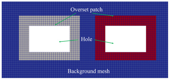 The dynamicOversetFvMesh of OpenFOAM, which is based on overset mesh technique, was selected as the mesh implementation for the wave flume and floating body. It combines the overset mesh technique with dynamic mesh capabilities, allowing for simulations of complex scenarios where geometries move relative to each other. In the overset mesh system, overlapping meshes are used to discretize the computational domain. Each mesh can be optimized for specific regions, like using a fine mesh around some structures and a coarse one for the rest, which enhances the efficiency and accuracy of simulations. The “dynamic” aspect enables the mesh to adapt to the movement of objects in the flow field over time, which is essential for problems of fluid–structure interactions. Since meshes can move and overlap without excessive stretching, compression, or distortion, simulations involving complex motions of floating breakwaters are achievable.