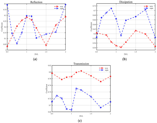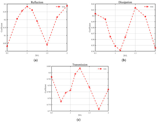 (a) Reflection coefficients, (b) dissipation coefficients, and (c) transmission coefficients of twin independent floating boxes as 2S/L varied for Group 1.