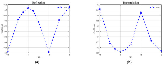 (a) Reflection and (b) transmission coefficients as 2S/L varied when both floating boxes were fixed.