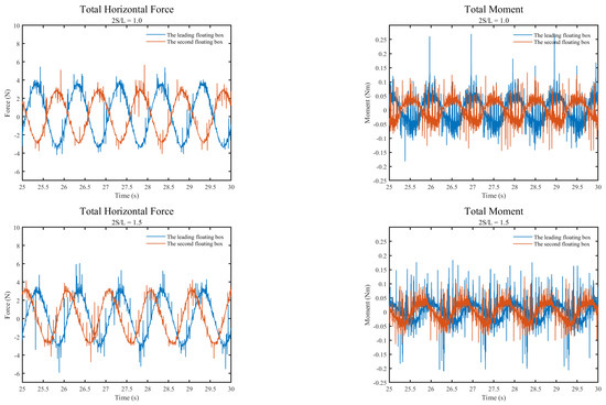 Figure 12 further shows the time-varying total horizontal forces and total moments of the two floating boxes when 2S/L = 1 and 1.5. When 2S/L = 1, the peaks of the horizontal total force for the first floating box were a little higher, and the valleys were a little lower than those for the second floating box. When 2S/L = 1.5, the peaks and valleys of the horizontal total force for the two floating boxes were similar in magnitude. The curves of the total horizontal force and moment exhibited an overall trend of change caused by wave actions, but there were also many small fluctuations, presumably due to turbulence around the boxes. Moreover, when 2S/L = 1, the overall trends of the horizontal total force variations, as well as the moment variations, for the first and second floating boxes were exactly in opposite phases. This further indicates that the two floating boxes should have been in a state of Bragg resonance when 2S/L = 1.