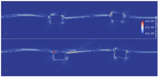 Vorticity near floating breakwaters at 2S/L = 1.0 when the box quantity was 2 (upper) and 3 (lower).