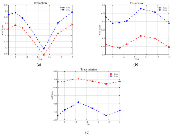 Figure 9 shows the reflection, dissipation, and transmission coefficients of twin independent floating boxes as 2S/L varied for Group 1. The specific calculated values can be found in Table 2. The reflection coefficients Kr and transmission coefficients Kt were calculated using Goda’s two-points method [27]. The dissipation coefficient Kd was then calculated based on the energy conservation principle: