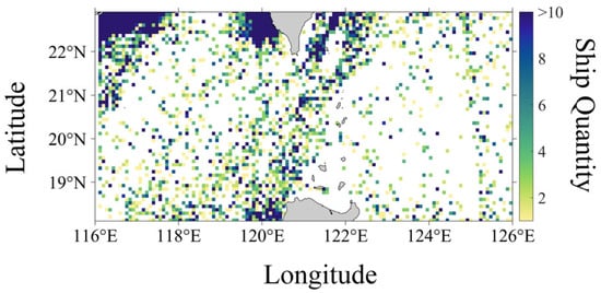 To model the ship noise field, information on the distribution of ship positions in the sea area is required. This study utilizes ship information data provided by the Automatic Identification System (AIS) for the sea area in August 2019. The total number of ships during this period is distributed as shown in Figure 1. After excluding berthed ships with a speed of less than 2 knots or data with abnormal motion exceeding 29 knots, the ship positions are statistically analyzed at one-hour intervals, each forming one time frame, resulting in a total of 744 time frames.
