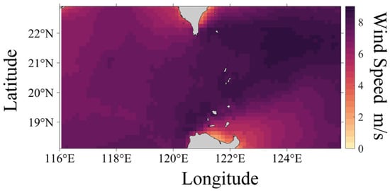 The wind-generated noise source level model requires wind speed data as input. This study utilizes the hourly sea surface wind speed data for August 2019 from the ERA5 global climate reanalysis dataset, provided by the European Centre for Medium-Range Weather Forecasts (ECMWF), with a resolution of 0.125° (See Figure 2). The monthly average temperature and salinity data required for the acoustic propagation model are also provided by the ECMWF, with a resolution of 0.083°. Bathymetric data are sourced from ETOPO 2022, a global bathymetry and topography dataset with an enhanced resolution of 15 arc-seconds. This global dataset integrates topographic, bathymetric, and coastline data from regional and global datasets, offering a comprehensive, high-resolution description of Earth’s surface geophysical features. This dataset serves as the seabed topography input for the underwater acoustic propagation model.