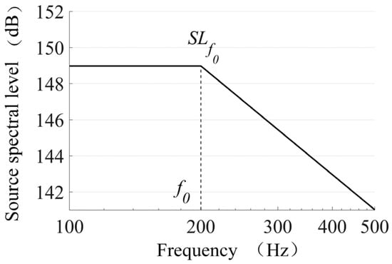 where , , and represent the ratios of ship length, ship speed, and draft to their respective reference values, while , , , and are parameters obtained through regression analysis. Using the parameters provided by Sakai, et al. [7], the C value for a cargo ship traveling at 12 knots is approximately 190 dB. However, this formula only describes the broadband noise level of ships, not the spectral level. Therefore, based on the characteristics of the continuous spectrum of ship noise, this study employs a simplified approach to model the spectral level of the noise source [30,31]: