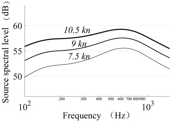 Combining Equations (2) and (3), we obtain the noise source spectral level formula for the 100–500 Hz band, enabling the modeling of radiated noise spectra for various ships. The case of a ship traveling at 12 knots is shown in Figure 3 as an example.