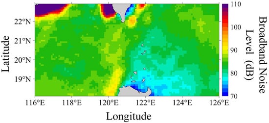 In this study, the 10th percentile ambient noise field within the research sea area was constructed using AIS data, wind field information, and noise source models, as illustrated in Figure 5. It can be observed that the high-noise areas in the strait channels and along the coastal waters correspond to regions with dense ship activity (Figure 1). And the distribution of low noise level regions is primarily associated with low wind speed fields in the coastal waters and the southeastern direction of the strait channel (Figure 2).