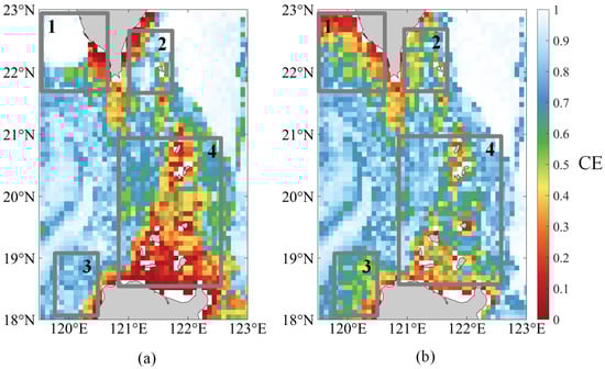 Firstly, the 10th percentile noise field was adopted as the noise background in conjunction with Equation (16) to construct a concealment effectiveness model with a grid resolution of 0.08° for the study area, as illustrated in Figure 6a. To better compare the superiority of the path planning method considering ambient noise fields, a fixed 85 dB noise level was used to calculate CE, as shown in Figure 6b, following the method of Qin, et al. [22]. The differences between the two are mainly concentrated in the sea area of 119.5°~123° E. Among them, boxes 1 to 3 are sea areas with relatively dense ship traffic. Stronger background noise reduces the probability of sonar detection, resulting in the appearance of higher CE values in Figure 6a. In contrast, the fourth area has less ship activity, with wind-generated noise being the main contributor to the background noise, resulting in relatively weaker noise levels, which leads to the appearance of lower CE values in Figure 6a.