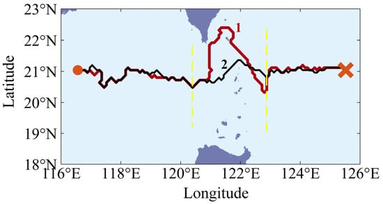 An underwater vehicle is required to traverse from the western side to the eastern side of a strait, with the capability to navigate through any available waterway. Utilizing a consistent parameter k (k = 10), path planning was conducted using different models of stealth effectiveness, with the results illustrated in Figure 7.