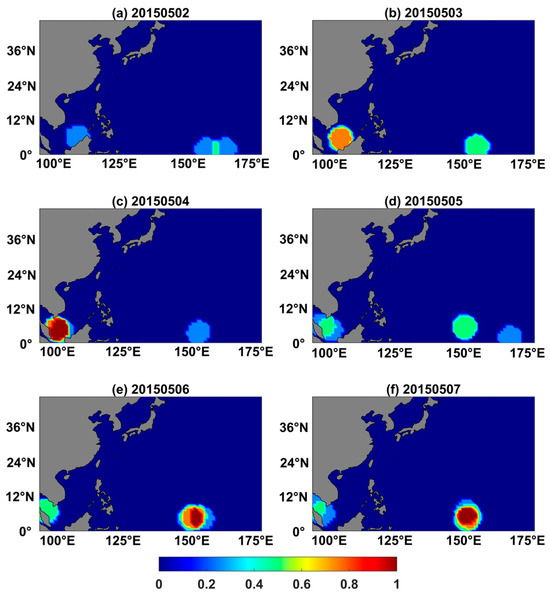 When evaluating TC forecasting on the S2S timescale, several factors may influence the evaluation. This study utilized the DTCP proposed previously [22] to find out how these factors affected forecasting skill. DTCP is defined as the probability of TC occurrence within a specific TC influence radius of a location and 1 day forecast time window. We computed DTCP on a grid and tested the influence of factors such as TC influence radius, forecast time window, etc. The computation of DTCP from observation was based on the IBTrACS data being collected every three hours. When calculating the DTCP from the models, TC center positions predicted by each ensemble member were used to compute the DTCP for that ensemble member, and the final DTCP for the ensemble prediction system was the average of the DTCP fields of all ensemble members in the model. As an example, Figure 1 shows the DTCP predictions of Typhoons Noul and Dolphin made by the KMA model from 2 May to 7 May 2015. Due to the fact that the KMA ensemble forecasting system has 4 ensemble members, there are 5 possible outcomes for calculating DTCP based on the model (DTCP values of 0, 0.25, 0.5, 0.75, and 1).
