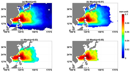 Observed climatological DTCP (p) for WNP under different evaluation region thresholds: (a) p ≥ 0 (no masking), (b) p ≥ 0.01, (c) p ≥ 0.03, and (d) p ≥ 0.05. Grid points with p below the threshold are masked (white). Data derived from IBTrACS (2015–2023).