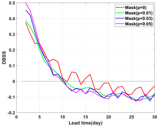 The meaning of the DBSS is to compare the Brier score from model forecast with the Brier score of reference climate forecast if D is ignored for convenience. When the forecast from a model is better than the reference climate forecast, the DBSS is greater than 0. The model forecast can provide further valuable information compared with a straightforward reference climate forecast. We removed the grid points with below a certain threshold when computing the basin-averaged DBSS. Some grid points were removed before computing the basin-averaged DBSS to avoid exceptionally negative values at these points. Both the two terms in the denominator of Equation (1) have climatological DTCP . If is zero, the value of DBSS at that point is not defined. If p is small, an exceptionally large negative DBSS may be generated.
