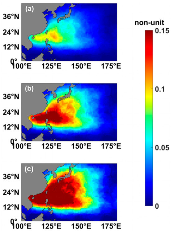 Spatial distribution of observed climatological DTCP using different TC influence radii: (a) 300 km, (b) 500 km, and (c) 700 km.