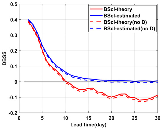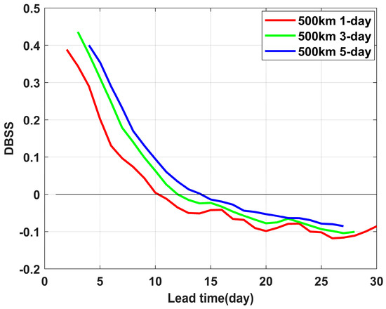 The experimental results presented in Figure 8 demonstrate that DBSSs computed using different methods remained nearly identical during the first 5 forecast days, but they began to diverge significantly after day 10. Notably, the mean DBSS based on approached zero after day 15, while that calculated using dropped below zero after day 10.