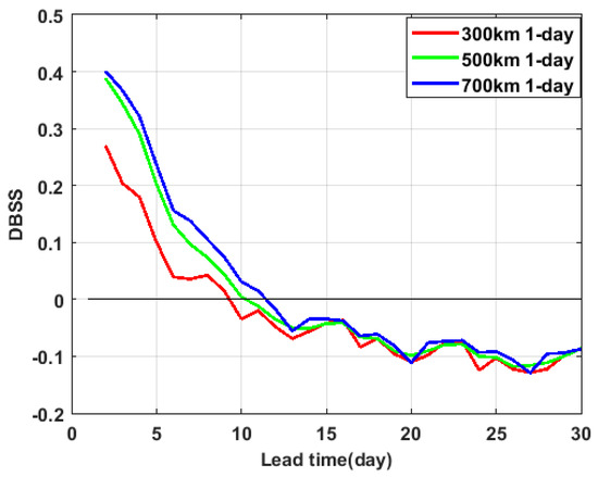 Similar to the selection of time windows, choosing the appropriate TC influence radius is crucial for evaluation. When the spatial range of forecast indicators are excessively broad, it is impossible to accurately locate TCs (such as ACE [18] or ‘box’ evaluation [19,20,21]), and overly specific forecast variables are also not suitable for the S2S scale (such as TC tracks [15]). In the definition of DTCP, the area within the TC influence radius is considered to be affected by the TC. The size of the TC influence radius can influence the calculation of DTCP. We examined the impact on mean DBSS by setting the TC influence radius to 300 km and 700 km, and compared the results with a TC influence radius of 500 km. As illustrated in Figure 6, the increase in the TC influence radius led to a larger area being affected by TC, consequently resulting in higher observed climatological DTCP.