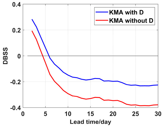 Figure 8 illustrates that including the D-term caused relatively minor variations in the mean DBSS. As indicated in Table 1, this limited impact can be attributed to the ECMWF model’s substantial ensemble size of 51 members, which resulted in a considerably small magnitude of the D correction term computed from Formula (5). To further examine the impact of D in models with smaller ensemble sizes, we conducted experiments using the KMA model, which operates with only four ensemble members. Figure 9 demonstrates a pronounced enhancement in mean DBSS following the implementation of the D correction term in the KMA model. This analysis clearly indicates that the D term plays a crucial role in models with small numbers of ensemble members, effectively correcting negative skill score biases, while its contribution becomes less significant in models with large ensemble sizes such as the ECMWF model.