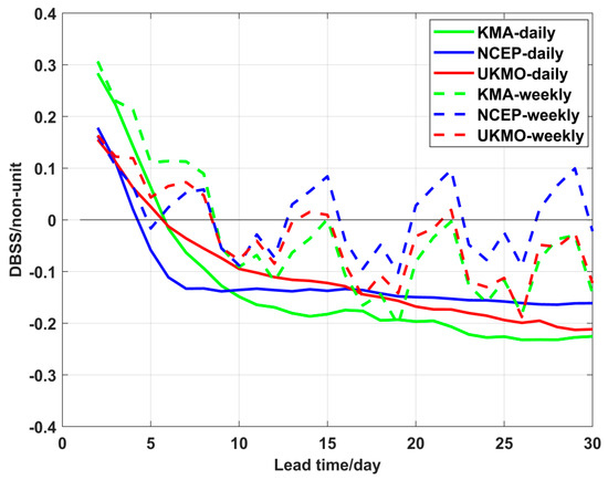 As shown in Figure 5, the mean DBSS of the ECMWF model increased with the extension of the forecast time window. The reason may have been that a longer forecast time window allowed for greater permissible errors in the model predictions, thereby leading to a higher mean DBSS. The increase of mean DBSS with a longer forecast time window is limited since the DBSS is the ratio of model forecast error and forecast error from a reference climate forecast (if the D term is ignored).